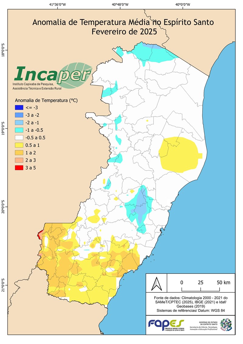 Anomalia de temperatura média - 2025 Para a geração dos mapas de anomalia de temperatura média foi utilizado como referência a climatologia de (2000-2021). Anomalia Anual de Temperatura Média em 2025: Anomalia Mensal de Temperatura Média em 2025: Janeiro/2025 Fevereiro/2025 Março/2025 Abril/2025 Maio/2025 Junho/2025 Julho/2025