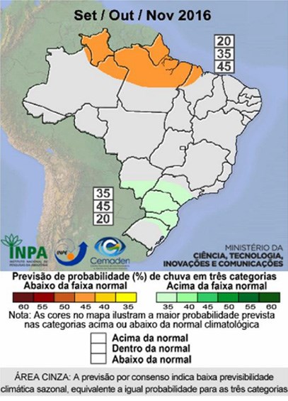 De acordo com essa previsão, que foi realizada no dia 25 de agosto de 2016, na maior parte do Brasil, a distribuição de probabilidade de chuva deve ser a mesma para as três categorias oriundas da metodologia utilizada na previsão, que são "acima", "abaixo" e "dentro da média" climatológica (figura 1). A equipe de previsão climática do MCTI chegou a esta conclusão devido à baixa previsibilidade dos modelos matemáticos de previsão climática para estas áreas do país.