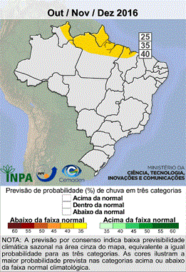 De acordo com essa previsão, que foi realizada no dia 26 de setembro de 2016, na maior parte do Brasil, a distribuição de probabilidade de chuva deve ser a mesma para as três categorias oriundas da metodologia utilizada na previsão, que são "acima", "abaixo" e "dentro da média" climatológica (figura 1). A equipe de previsão climática do MCTI chegou a esta conclusão devido à baixa previsibilidade dos modelos matemáticos de previsão climática para estas áreas do país.