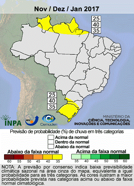 A previsão climática por consenso para o trimestre novembro-dezembro-janeiro de 2016-2017 (NDJ/2016-2017) elaborada pelo Grupo de Trabalho em Previsão Climática Sazonal do Ministério da Ciência, Tecnologia, Inovações e Comunicações (GTPCS/MCTIC), com a colaboração de meteorologistas do INMET (Instituto Nacional de Meteorologia) e Centros Estaduais de Meteorologia, baseia-se na análise diagnóstica das condições oceânicas e atmosféricas globais e nos prognósticos de modelos dinâmicos e estatísticos de previsão climática sazonal.