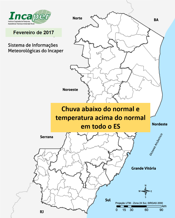 Prognóstico para o trimestre FMA de 2017*: de maneira geral, chuva abaixo do normal na maior parte do estado e temperatura mais alta que o normal em todo o Espírito Santo.