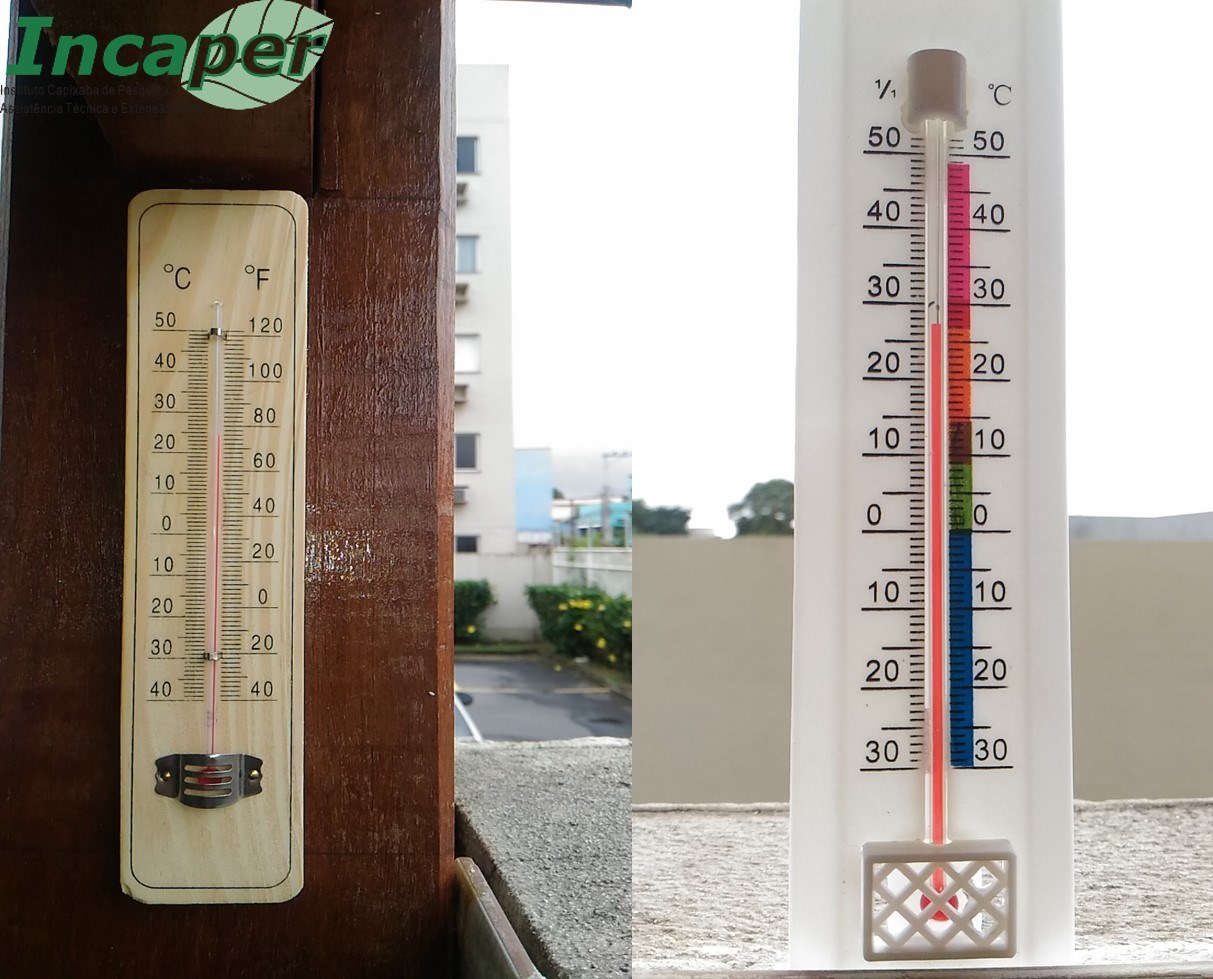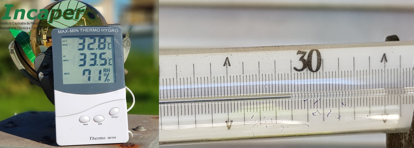 Figura 5 - Comparação entre um termômetro digital exposto diretamente ao sol e um termômetro de mercúrio dentro do abrigo meteorológico. Fonte: acervo pessoal/Meteorologia – Incaper.