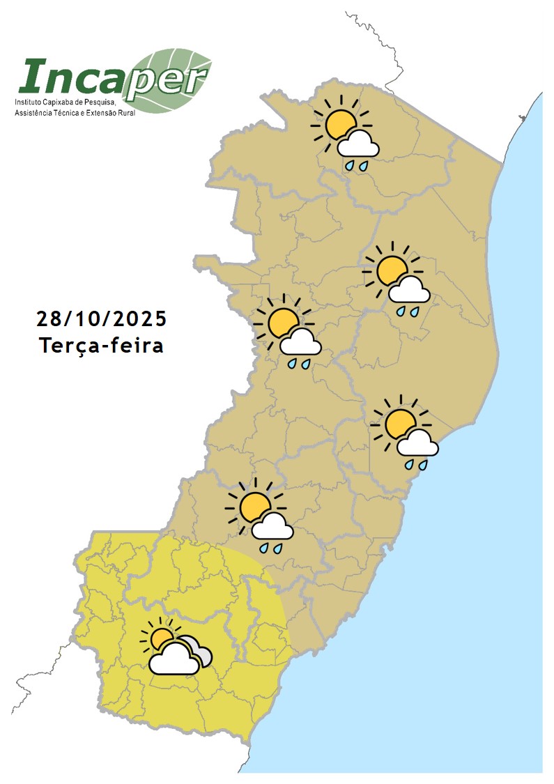 A terça-feira, será com sol e variação de nuvens, em todas as regiões. Previsão de chuvisco rápido, em alguns momentos do dia, na metade norte do Estado, na Grande Vitória, parte norte das "três santas". Sem previsçao de chuva no extremo sul capixaba. Pequena elevação nas temperaturas.