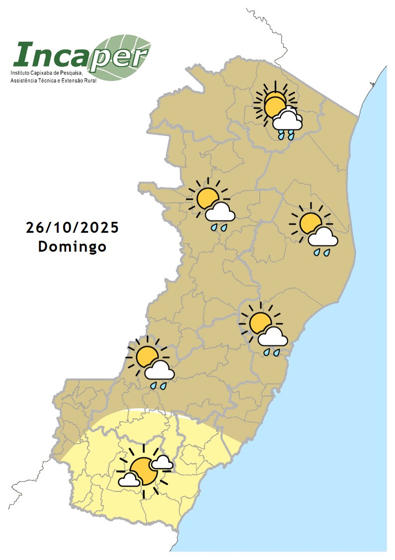 Domingo, a umidade marítima trazida por ventos costeiros, favorece a formação de nuvens de chuva no Espírito Santo. Previsão de chuva rápida em boa parte do Estado, exceto no estremo sul capixaba. As temperaturas sobem um pouco mais, em todas as regiões.